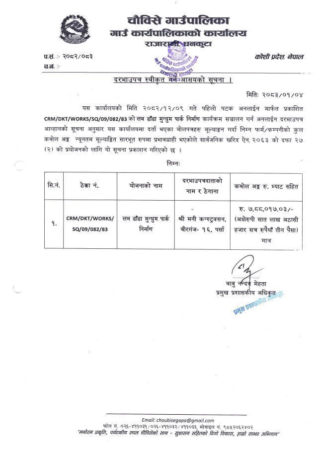बोलपत्र स्वीकृत गर्ने आसयको सूचना (चौबाटे खेलमैदान बहुउदेश्यिय कवर्डहल निर्माण)