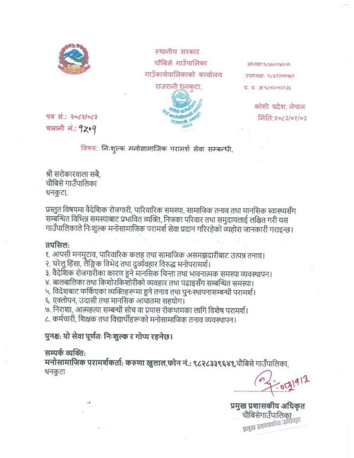 » नि:शुल्क मनोसामजिक परामर्श सेवा सम्बन्धी सूचना !!!