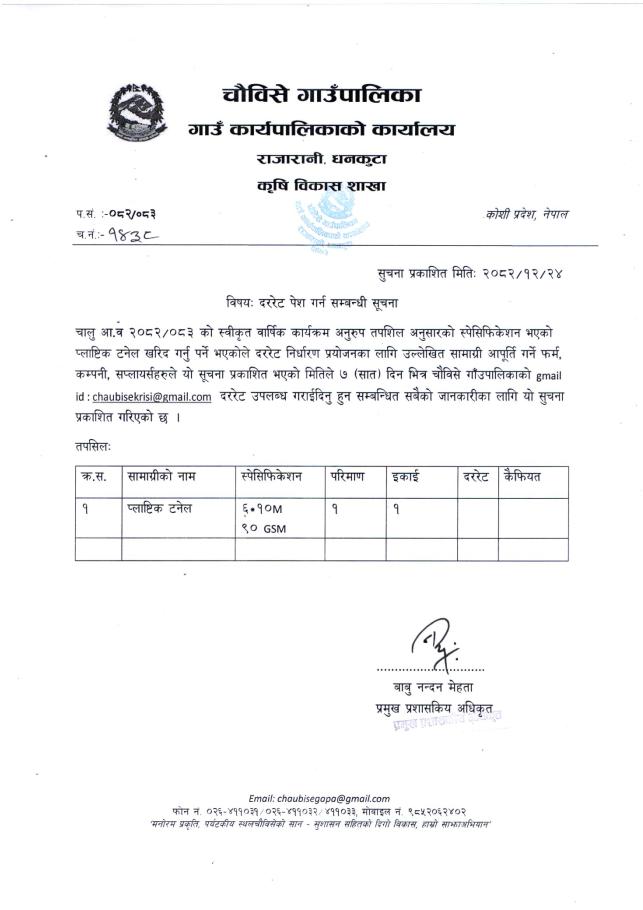 प्लाष्टिक टनेलको दररेट पेश गर्ने सम्बन्धी सूचना