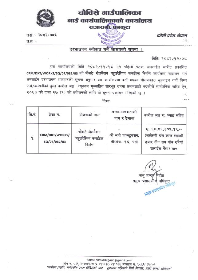 बोलपत्र स्वीकृत गर्ने आसयको सूचना (चौबाटे खेलमैदान बहुउदेश्यिय कवर्डहल निर्माण)