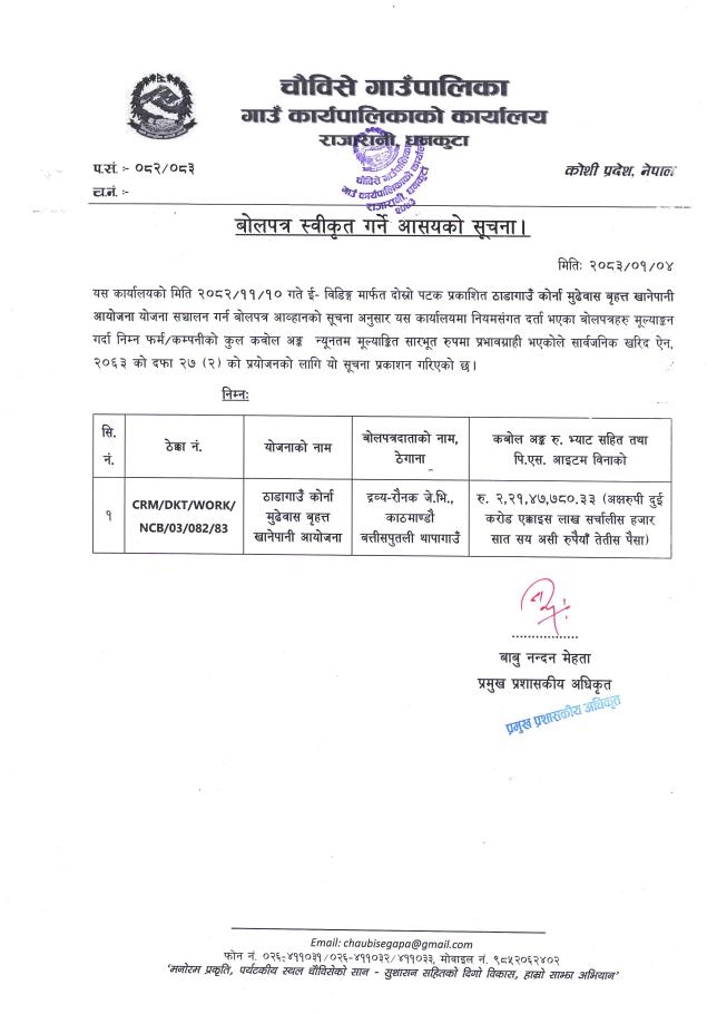 बोलपत्र स्वीकृत गर्ने आसयको सूचना (ठाडागाउँ कोर्ना मुढेवास बृहत्त खानेपानी)