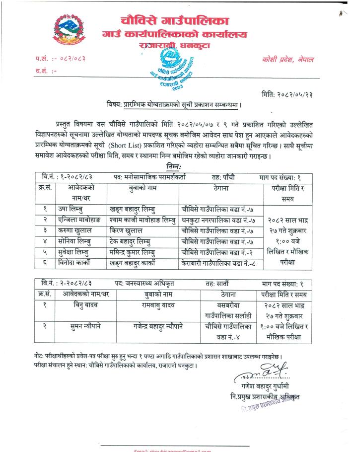प्रारम्भिक योग्यताक्रमको सूची प्रकाशन सम्बन्धमा ।