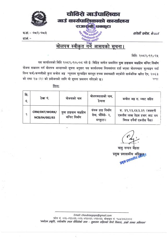 बोलपत्र स्वीकृत गर्ने आसयको सूचना (युमा हाङ्गसाम माङहिम मन्दिर निर्माण)