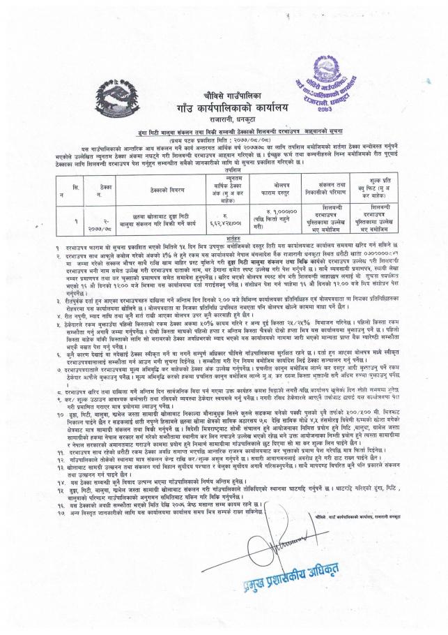 » ढुंगा गिटी बालुवा संकलन तथा विक्री सम्बन्धि ठेक्काको सिलबन्दी दरभाउपत्र आह्वानको सूचना