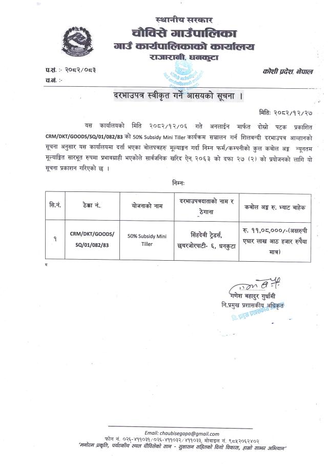 दरभाउपत्र स्वीकृत गर्ने आसयको सूचना (50% Subsidy of Mini Tiller)