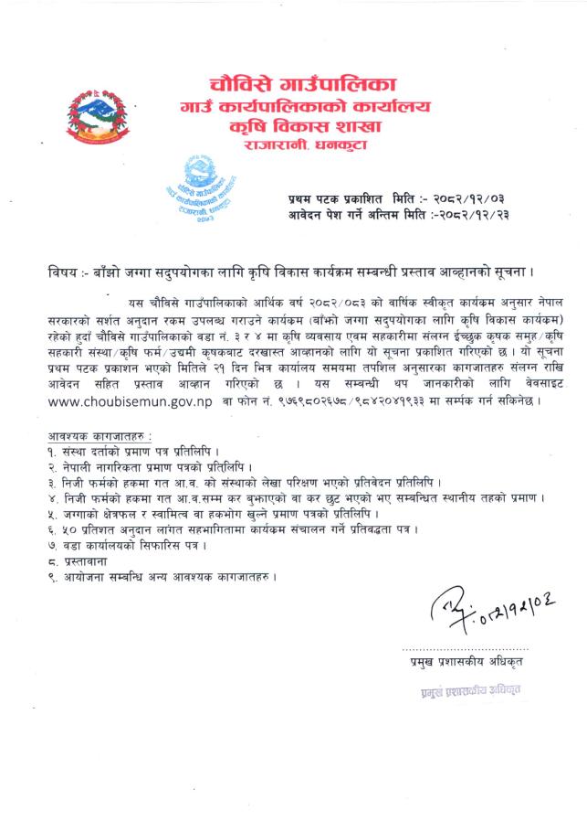 » बाँझो जग्गा सदपुयोगका लागि कृषि विकास कार्यक्रम सम्बन्धी प्रस्ताव आव्हानको सूचना