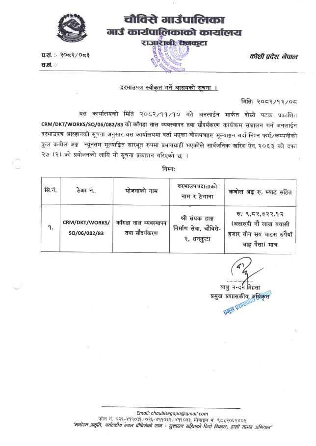 बोलपत्र स्वीकृत गर्ने आसयको सूचना (काँगडा ताल व्यवस्थापन तथा सौदर्यकरण)