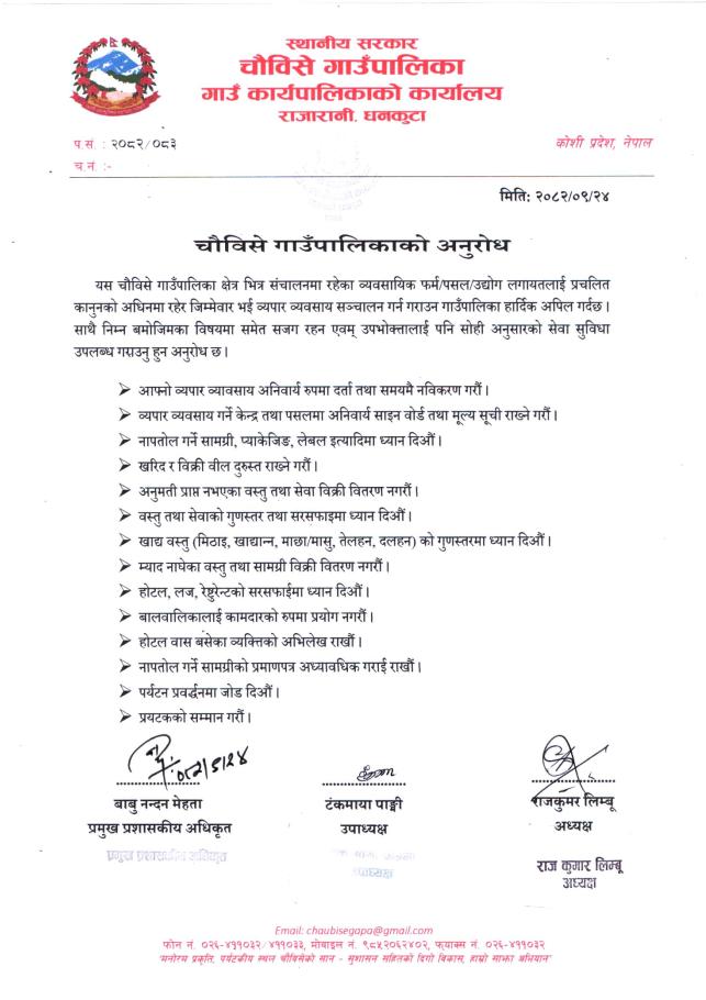 यस चौविसे गाउँपालिका क्षेत्र भित्र संचालनमा रहेका व्यवसायिक फर्म/पसल/उद्योग लगायतलाई प्रचलित कानुनको अधिनमा रहेर जिम्मेवार भई व्यपार व्यवसाय सञ्चालन गर्न गराउन गाउँपालिका हार्दिक अपिल गर्दछ ।