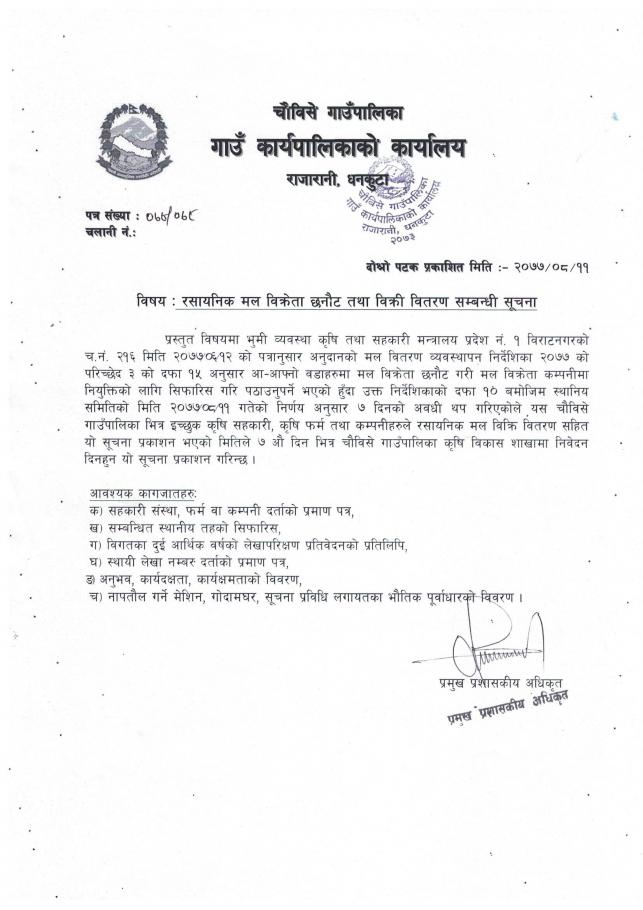 » रसायनिक मल विक्रेता छनौट तथा विक्री वितरण सम्बन्धि सूचना