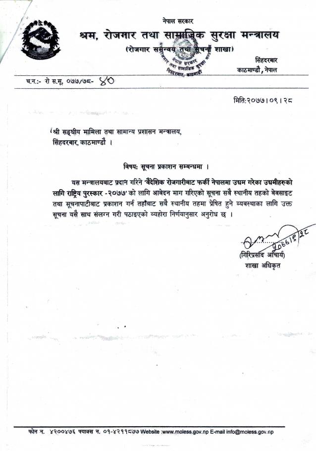 श्रम, रोजगार तथा सामाजिक सुरक्षा मन्त्रालयको ''वैदेशिक राेजगारीबाट फर्किएका स्वदेशी उद्यमीलाई राष्ट्रिय सम्मान तथा पुरस्कार सम्बन्धी सूचना"