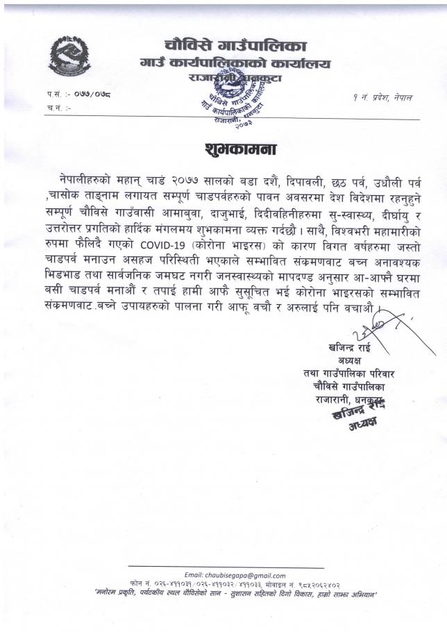 २०८२ सालको महान चाड वडादशैं, तिहार, छठ पर्व, चासोक तङ्नाम लगायतका सम्पूर्ण चाडपर्वहरुको पावन अवसरमा देश तथा विदेशमा रहनुहुने सम्पूर्ण चौविसे गाउँ वासी आमा-बुवा, दाजुभाइ, दिदीबहिनीहरुमा सु-स्वास्थ्य, दीर्घायु र उत्तरोत्तर प्रगतिको हार्दिक मंगलमय शुभकामना