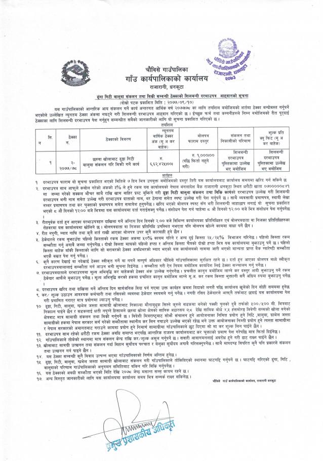 ढुंगा, गिटी, वालुवा संकलन तथा बिक्री सम्बन्धी ठेक्काको सिलबन्दी दरभाउपत्रको सूचना ।
