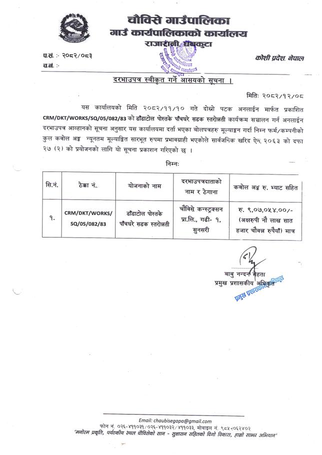 बोलपत्र स्वीकृत गर्ने आसयको सूचना (डाँडाटोल पोस्तके पाँचघरे सडक स्तरोन्नती)